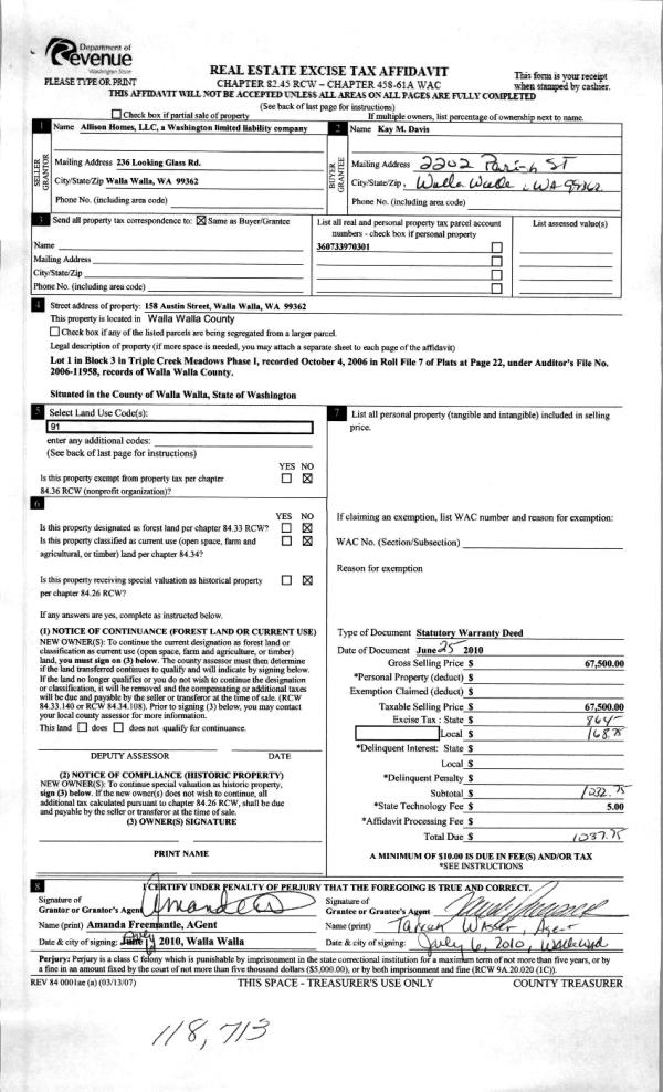 | 4 | 07/06/2010 | WARRANTY D | WARRANTY DEED | ALLISON HOMES LLC | DAVIS, KAY M | | | $67,500.00 | 118713 | 2010-05209 |