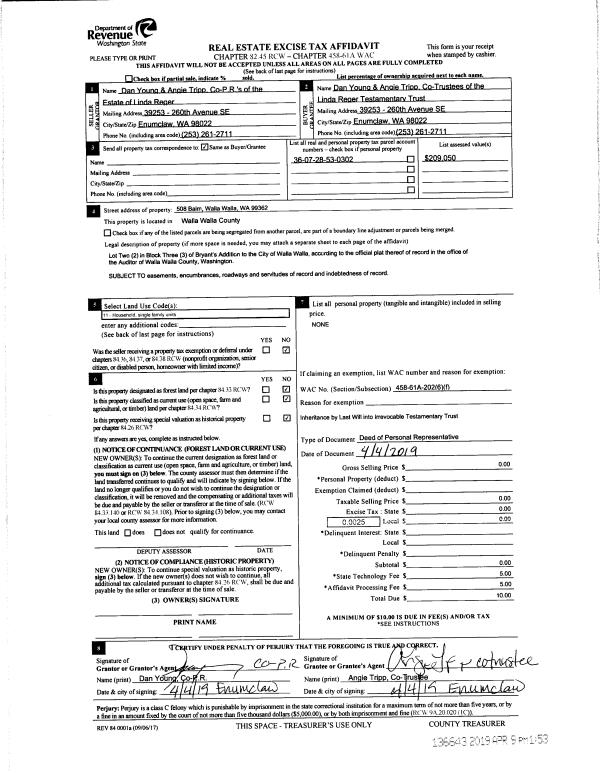 | 2 | 04/04/2019 | DPR | DEED OF PERSONAL REPRESENTATIVE | REGER LINDA K | REGER LINDA TESTAMENTARY TRUST | | | $0.00 | 136643 | 2019-02223 |