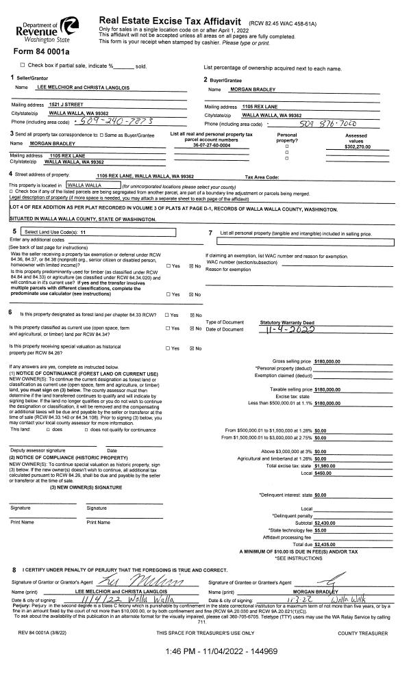 | 1 | 11/04/2022 | SWD | STATUTORY WARRANTY DEED | MELCHIOR LEE | BRADLEY MORGAN | | | $180,000.00 | 144969 | 2022-08947 |