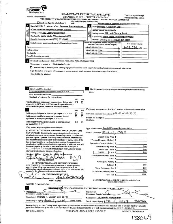 | 1 | 11/14/2019 | DPR | DEED OF PERSONAL REPRESENTATIVE | MAXSON BENJAMIN KENNETH | MAXSON-BOX MICHELLE R | 3 PARCELS | | $0.00 | 138069 | 2019-09374 |