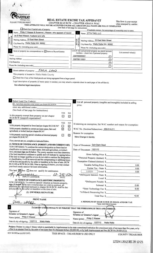 | 3 | 12/28/2012 | QCD | QUIT CLAIM DEED | WASSER, PHILIP C & S REID | ETTA TWO LLC | | | $0.00 | 123241 | 2012-11616 |