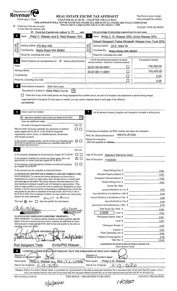 | 1 | 11/12/2020 | WARRANTY D | WARRANTY DEED | WASSER PHILIP C & SUZANNE L 75% | OZELLA C WASSER SURVIVORS TRUST AND EMILY ANNE REID WASSER AND | | | | 140330 | 11/12/2020 |