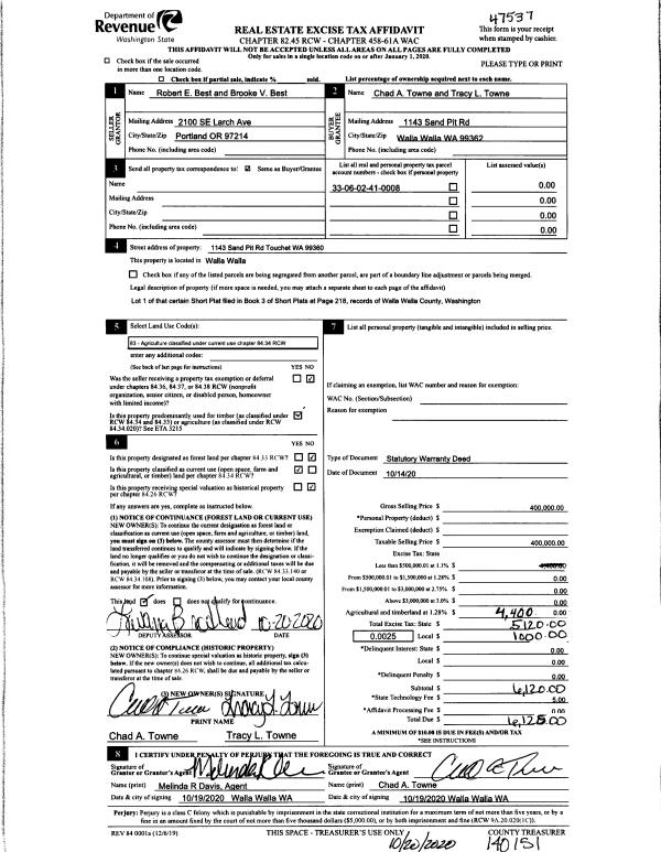 | 1 | 10/20/2020 | SWD | STATUTORY WARRANTY DEED | BEST ROBERT E & BROOKE V | TOWNE CHAD A & TRACY L | | | $400,000.00 | 140151 | 2020-10906 |