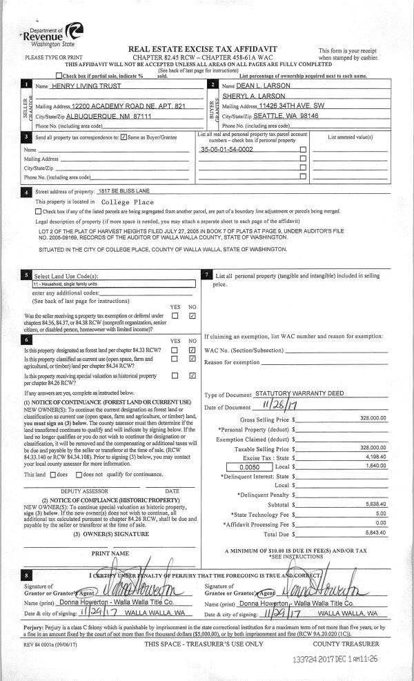 | 1 | 12/01/2017 | SWD | STATUTORY WARRANTY DEED | HENRY LIVING TRUST | LARSON DEAN L & SHERYL A | | | $328,000.00 | 133724 | 2017-09623 |