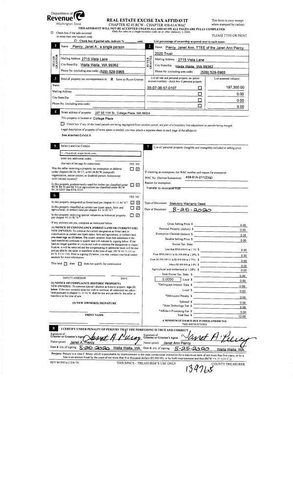 | 1 | 08/26/2020 | WARRANTY D | WARRANTY DEED | PIERCY JANET A | PIERCY JANET ANN 2020 TRUST | | | | 139765 | 2020-08540 |