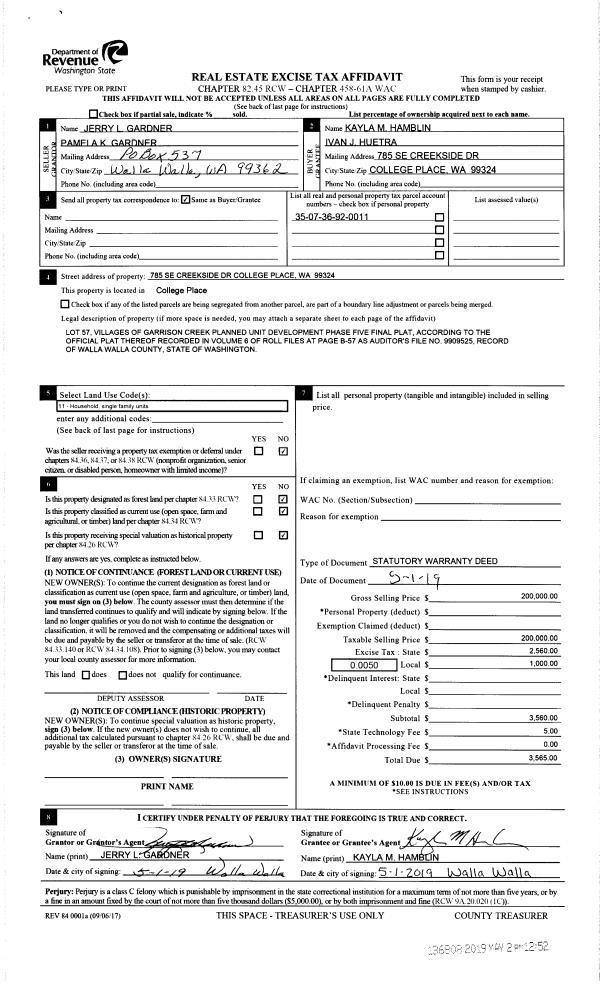 | 1 | 05/02/2019 | SWD | STATUTORY WARRANTY DEED | GARDNER JERRY L & PAMELA K | HAMBLIN KAYLA M & IVAN J HUETRA | | | $200,000.00 | 136808 | 2019-02869 |