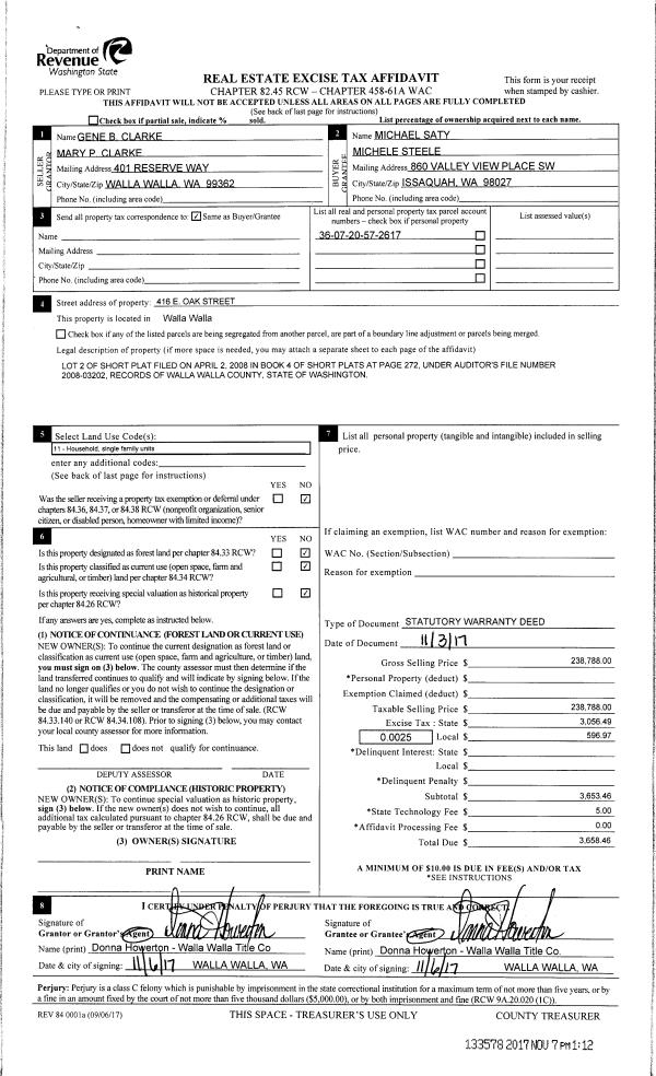 | 1 | 11/07/2017 | SWD | STATUTORY WARRANTY DEED | CLARKE GENE B & MARY P | SATY MICHAEL | | | $238,788.00 | 133578 | 2017-08970 |
