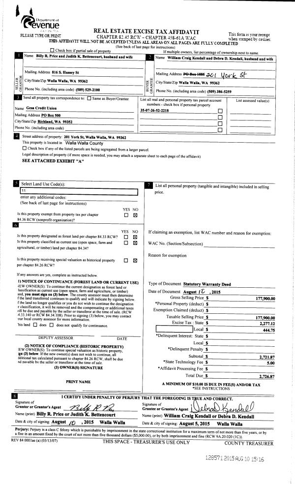 | 3 | 08/10/2015 | SWD | STATUTORY WARRANTY DEED | PRICE BILLY R | KENDALL WILLIAM CRAIG & DEBRA D | | | $177,900.00 | 128571 | 2015-06918 |