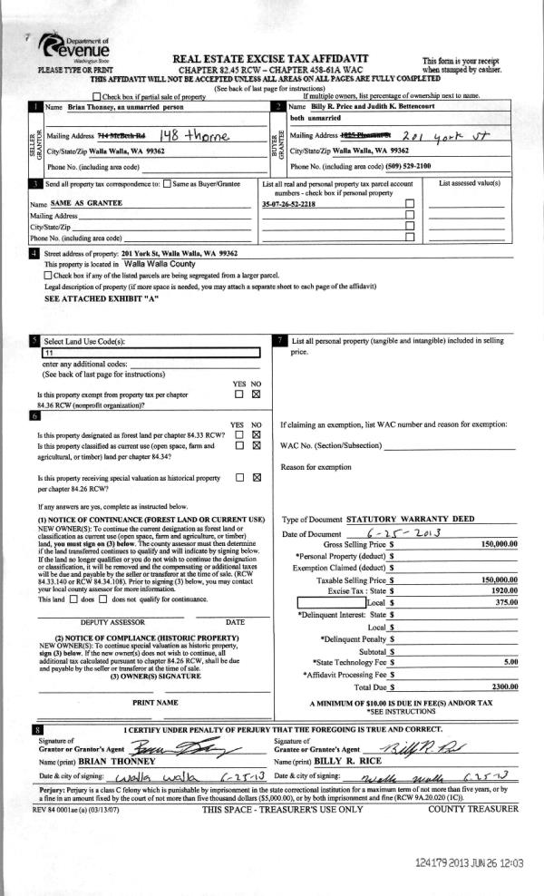 | 4 | 06/25/2013 | WARRANTY D | WARRANTY DEED | THONNEY, BRIAN | PRICE, BILLY R | | | $150,000.00 | 124179 | 2013-06408 |