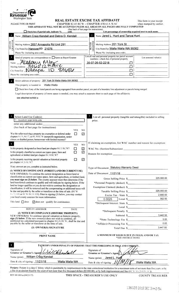 | 2 | 12/03/2018 | SWD | STATUTORY WARRANTY DEED | KENDALL WILLIAM CRAIG & DEBRA D | HUNT JARED L & TANYA | | | $225,000.00 | 136028 | 2018-09998 |