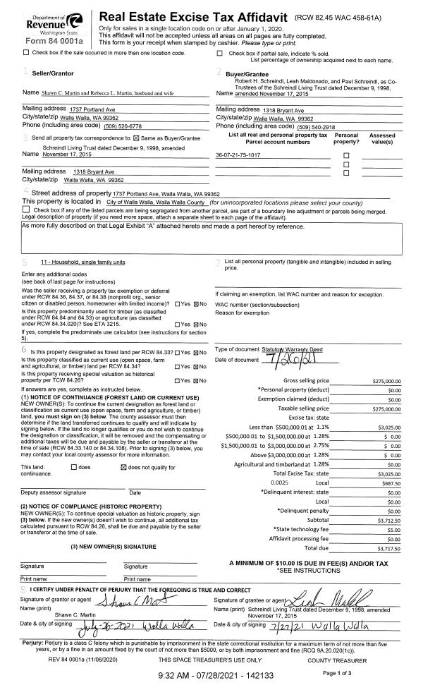 | 2 | 07/28/2021 | SWD | STATUTORY WARRANTY DEED | MARTIN SHAWN C & REBECCA L | SCHREINDL LIVING TRUST | | | $275,000.00 | 142133 | 2021-09165 |