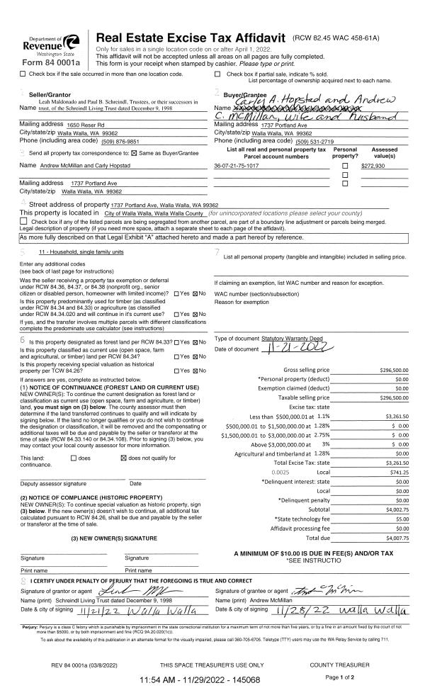 | 1 | 11/29/2022 | SWD | STATUTORY WARRANTY DEED | SCHREINDL LIVING TRUST | HOPSTAD CARLY A & ANDREW C MCMILLAN | | | $296,500.00 | 145068 | 2022-09397 |