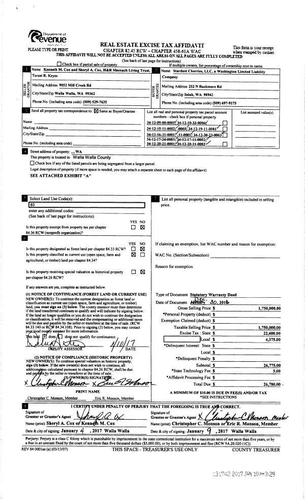 | 2 | 01/10/2017 | SWD | STATUTORY WARRANTY DEED | COX KENNETH & SHERYL ETAL | STARDUST CHERRIES LLC | | 12-PARCELS | $1,750,000.00 | 131742 | 2017-00240 |