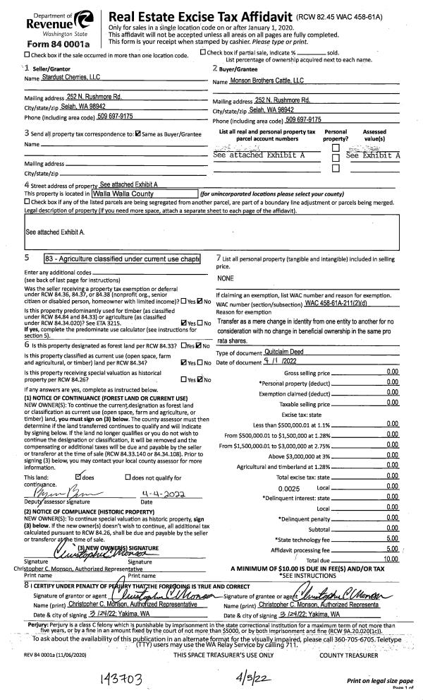 | 1 | 04/01/2022 | QCD | QUIT CLAIM DEED | STARDUST CHERRIES LLC | MONSON BROTHERS CATTLE LLC | | | $0.00 | 143703 | 2022-02815 |