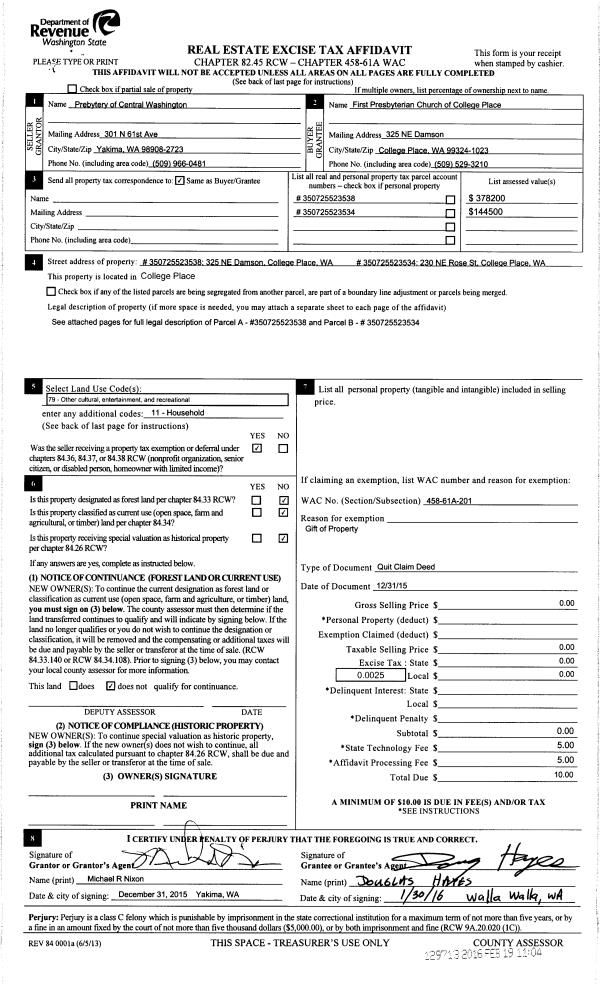 | 1 | 01/30/2016 | QCD | QUIT CLAIM DEED | COLLEGE PLACE PRESBYTERIAN CHURCH | FIRST PRESBYTERIAN CHURCH OF COLLEGE PLACE | | | $0.00 | 129713 | 2016-01244 |