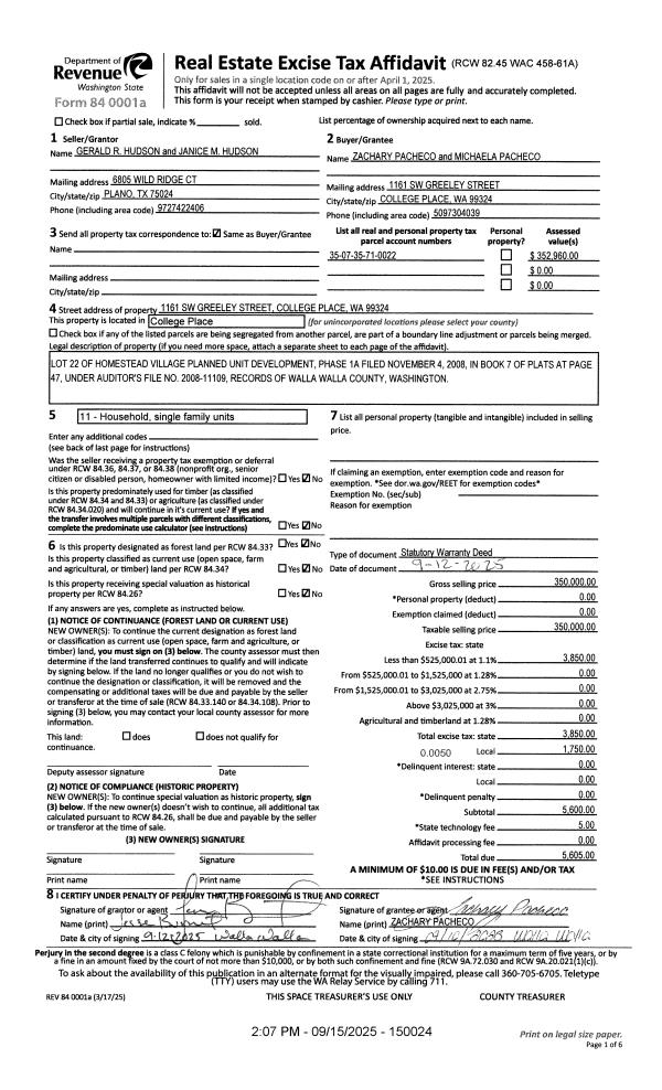| 1 | 09/15/2025 | SWD | STATUTORY WARRANTY DEED | HUDSON GERALD R & JANICE M | PACHECO ZACHARY & MICHAELA | | | $350,000.00 | 150024 | 2025-05579 |