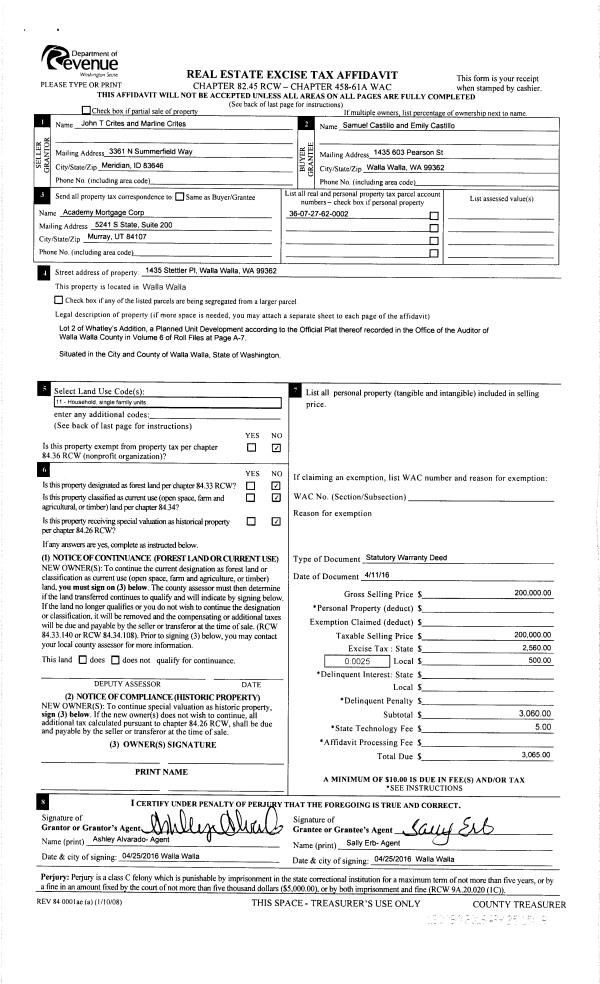 | 1 | 04/25/2016 | SWD | STATUTORY WARRANTY DEED | CRITES JOHN T & MARLINE | CASTILLO SAMUEL & EMILY | | | $200,000.00 | 130090 | 2016-03045 |