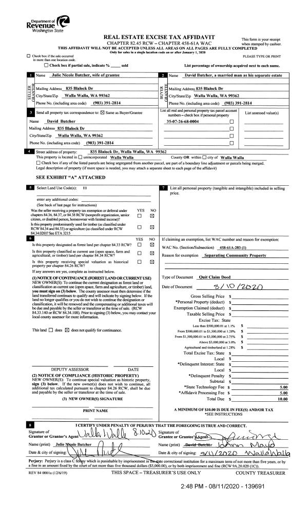| 1 | 08/11/2020 | QCD | QUIT CLAIM DEED | BUTCHER JULIE NICOLE | BUTCHER DAVID | | | | 139691 | 2020-07931 |