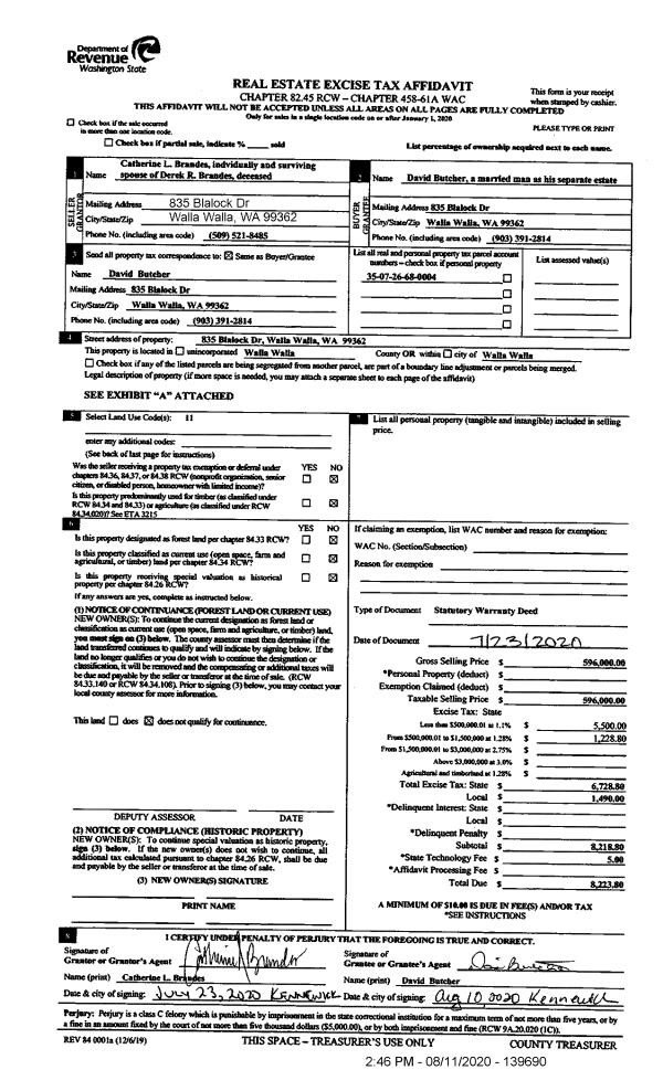 | 2 | 08/11/2020 | SWD | STATUTORY WARRANTY DEED | BRANDES CATHERINE L | BUTCHER DAVID | | | $596,000.00 | 139690 | 2020-07930 |