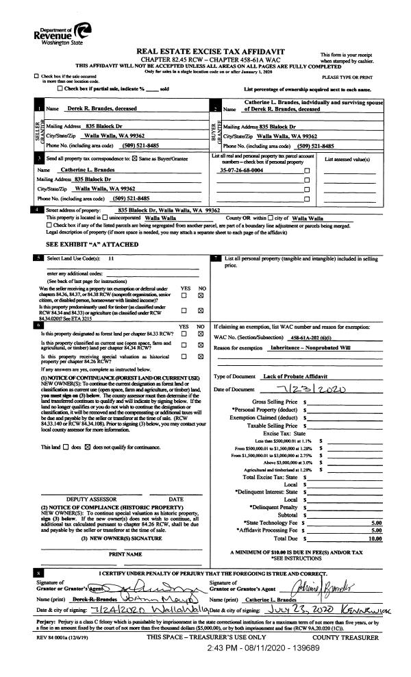 | 3 | 07/23/2020 | LOPA | LACK OF PROBATE AFFIDAVIT | BRANDES DEREK R & CATHERINE L | BRANDES CATHERINE L | | | $0.00 | 139689 | 2020-07929 |
