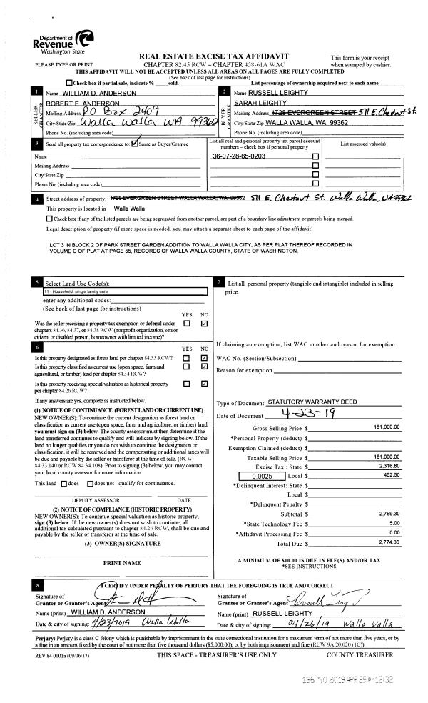| 2 | 04/29/2019 | SWD | STATUTORY WARRANTY DEED | ANDERSON WILLIAM D | LEIGHTY RUSSELL & SARAH | | | $181,000.00 | 136770 | 2019-02750 |