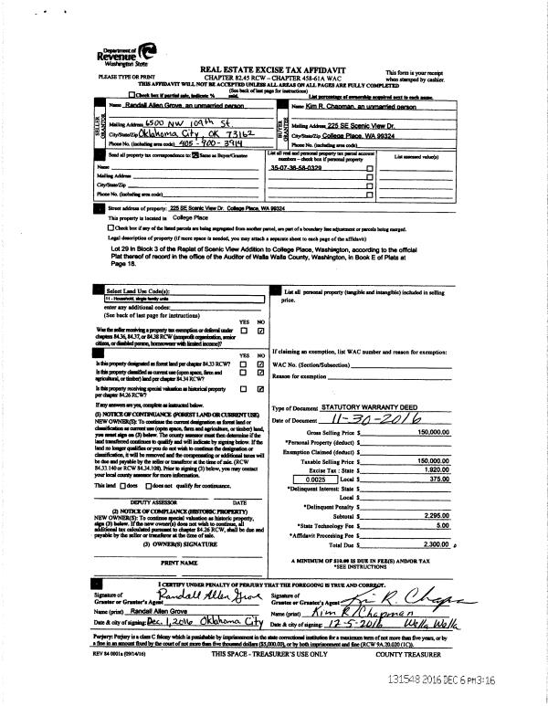 | 1 | 12/06/2016 | SWD | STATUTORY WARRANTY DEED | GROVE RANDALL ALLEN | CHAPMAN KIM R | | | $150,000.00 | 131548 | 2016-10022 |