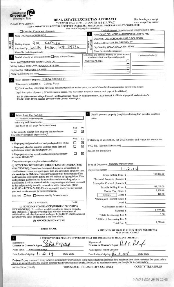 | 3 | 01/08/2014 | SWD | STATUTORY WARRANTY DEED | MC FETRIDGE PATRICK | DEL MORO DAVID & SARAH | | | $168,000.00 | 125241 | 2014-00154 |