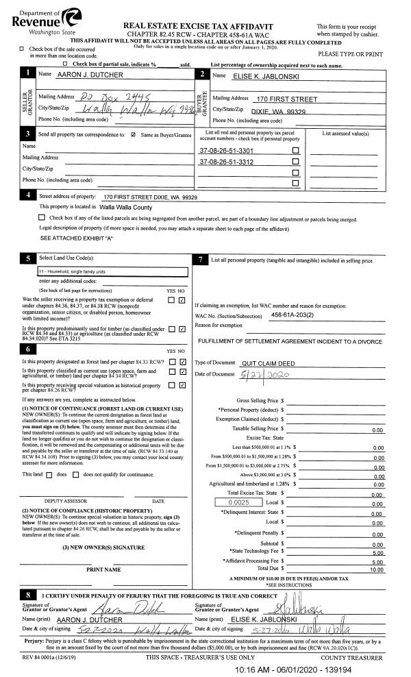 | 1 | 05/27/2020 | QCD | QUIT CLAIM DEED | DUTCHER AARON J & ELISE K | JABLONSKI ELISE K | | 2 PARCELS | $0.00 | 139194 | 2020-04842 |