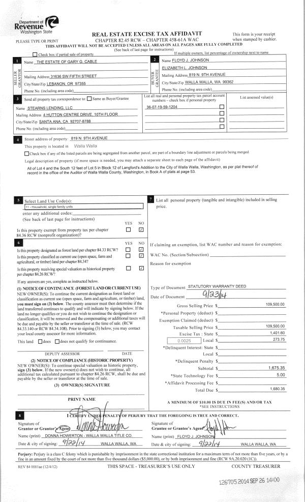 | 2 | 09/23/2014 | SWD | STATUTORY WARRANTY DEED | CABLE GARY G ESTATE OF | JOHNSON FLOYD J & ELIZABETH L | | | $109,500.00 | 126705 | 2014-07065 |