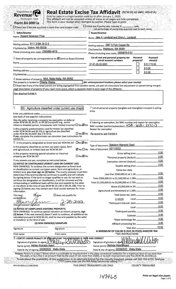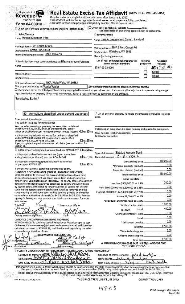 | 2 | 02/18/2022 | SWD | STATUTORY WARRANTY DEED | PRICE HOWARD STEVENSON | LANDGRAF JAKE A & GINNY L | | | $160,000.00 | 143415 | 2022-01495 |
