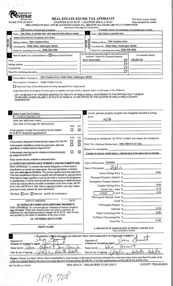 | 5 | 02/07/2011 | QCD | QUIT CLAIM DEED | GRANT, DAN | GRANT, DAN | | | | 119708 | 2011-01208 |