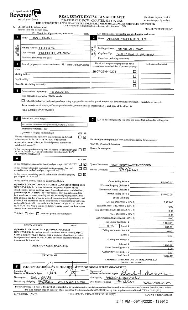 | 4 | 09/14/2020 | SWD | STATUTORY WARRANTY DEED | GRANT DAN | ARLEAH PROPERTIES LLC | | | $315,000.00 | 139912 | 2020-09403 |