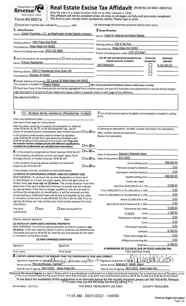 | 3 | 08/31/2022 | SWD | STATUTORY WARRANTY DEED | ARLEAH PROPERTIES LLC | NIDEROST TARAH M & MARIO BATALLA | | | $458,000.00 | 144590 | 2022-07291 |