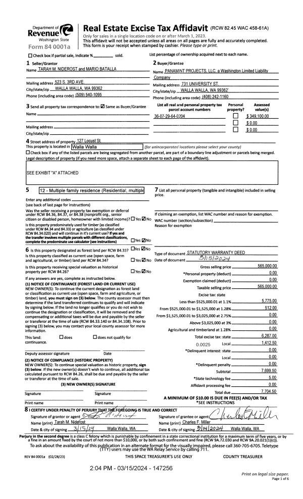 | 2 | 03/15/2024 | SWD | STATUTORY WARRANTY DEED | NIDEROST TARAH M & MARIO BATALLA | PANAMINT PROJECTS LLC | | | $565,000.00 | 147256 | 2024-01277 |