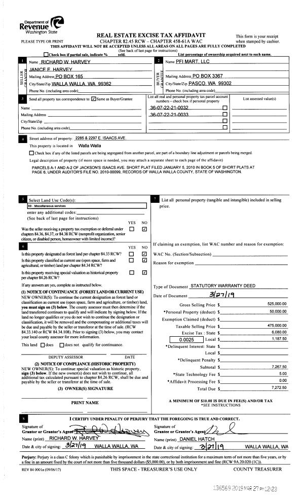 | 2 | 03/27/2019 | SWD | STATUTORY WARRANTY DEED | HARVEY RICHARD W & JANICE | PFI MART LLC | | 2-PARCELS | $475,000.00 | 136569 | 2019-01920 |