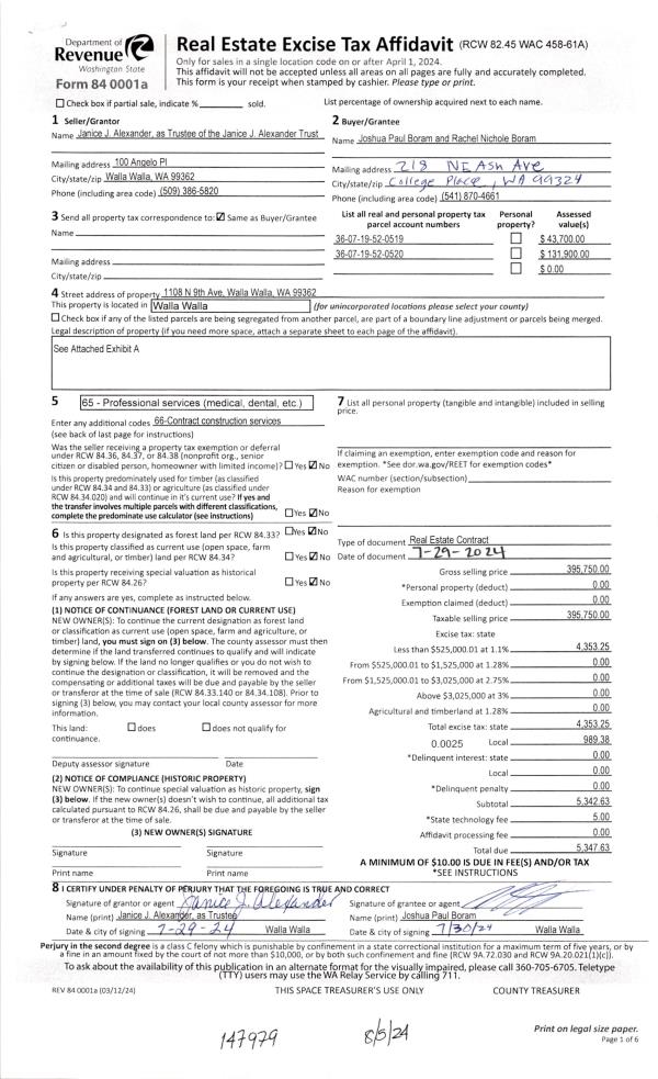 | 2 | 08/05/2024 | REAL ESTAT | REAL ESTATE CONTRACT | ALEXANDER JANICE J TRUST | BORAM JOSHUA PAUL & RACHEL NICHOLE | | | $395,750.00 | 147979 | 2024-04261 |