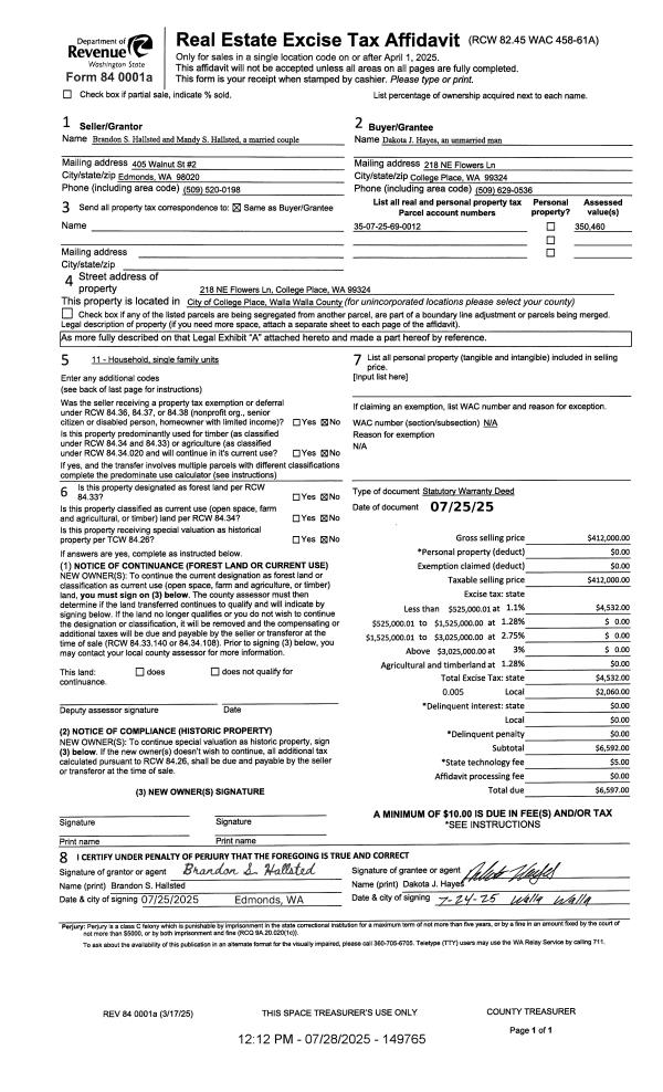 | 1 | 07/28/2025 | SWD | STATUTORY WARRANTY DEED | HALLSTED MANDY S & BRANDON S | HAYES DAKOTA J | | | $412,000.00 | 149765 | 2025-04362 |