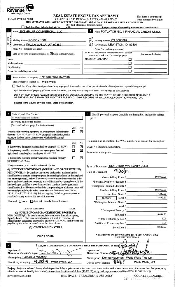 | 1 | 09/20/2019 | SWD | STATUTORY WARRANTY DEED | EXEMPLAR COMMERCIAL LLC | POTLATCH NO 1 FINANCIAL CREDIT UNION | | | $565,000.00 | 137731 | 2019-07422 |