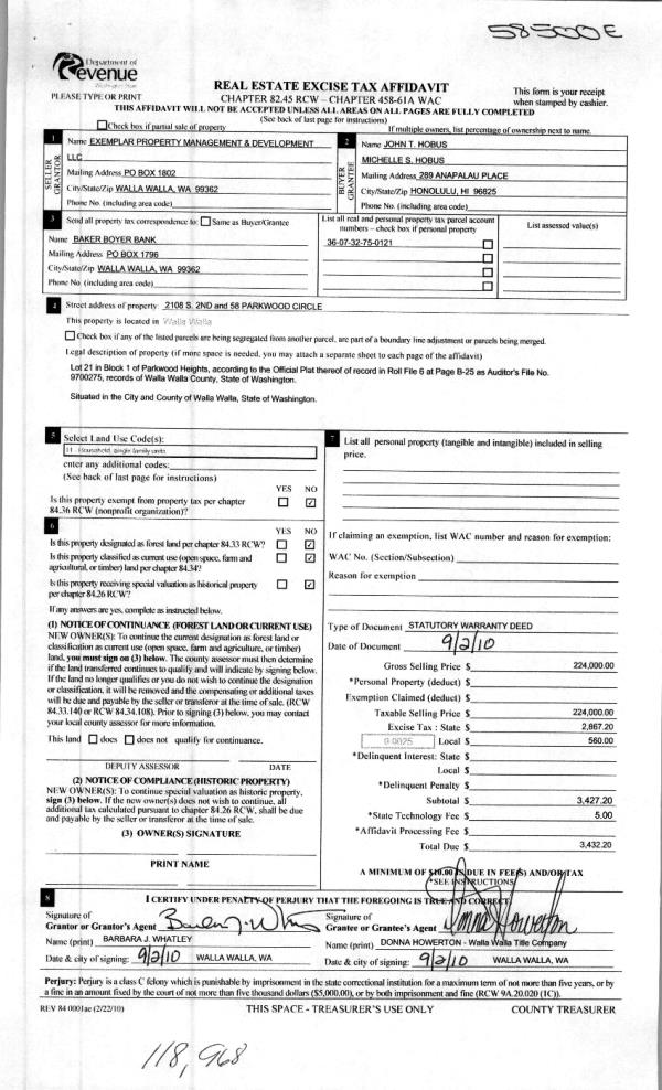 | 3 | 09/03/2010 | WARRANTY D | WARRANTY DEED | EXEMPLAR PROPERTY MANAGEMENT & | HOBUS, JOHN T & MICHELLE S | | | $224,000.00 | 118968 | 2010-06919 |