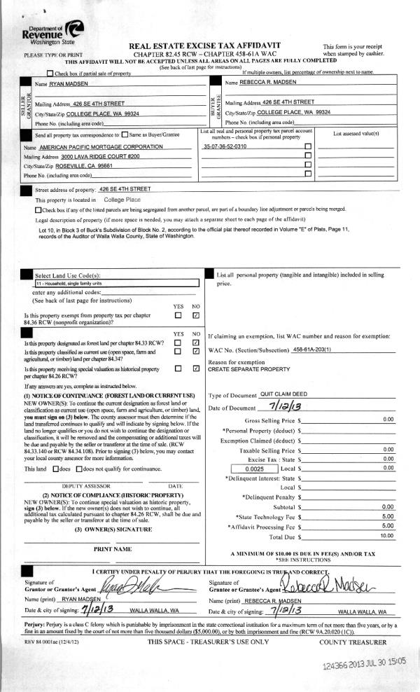 | 5 | 07/30/2013 | QCD | QUIT CLAIM DEED | MADSEN, RYAN | MADSEN, REBECCA R | | | $0.00 | 124366 | 2013-07720 |