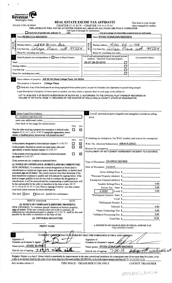 | 3 | 07/29/2019 | COURT CASE | COURT CASE | MADSEN RYAN D & REBECCA R | MADSEN RYAN DONAVAN | | | $0.00 | 137378 | CC 17-3-00108-7 |