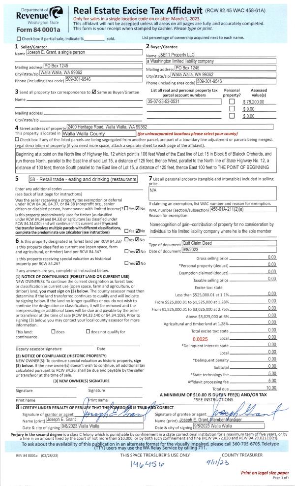 | 2 | 09/11/2023 | QCD | QUIT CLAIM DEED | GRANT JOSEPH E | J&E11 PROPERTY LLC | | | | 146456 | 2023-05276 |