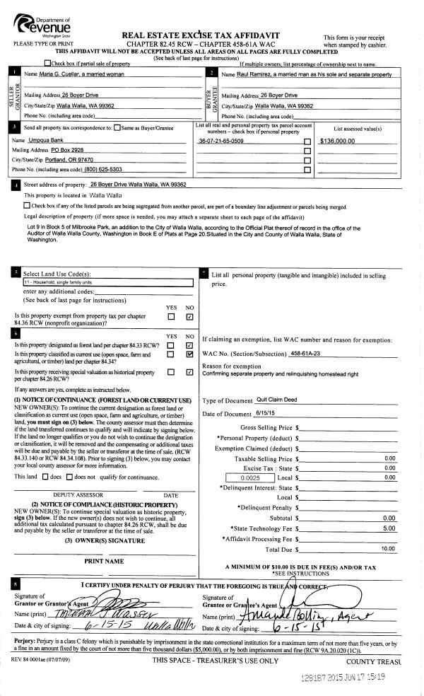 | 2 | 06/17/2015 | QCD | QUIT CLAIM DEED | CUELLAR MARIA G | RAMIREZ RAUL | | | | 128187 | 2015-05079 |