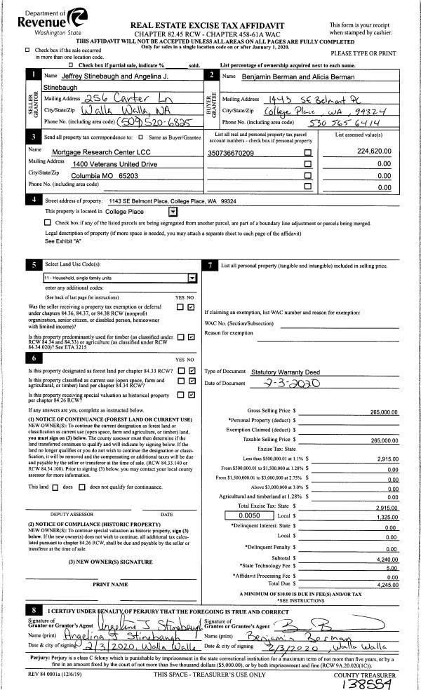 | 1 | 02/03/2020 | SWD | STATUTORY WARRANTY DEED | STINEBAUGH JEFFREY & ANGELINA J | BERMAN BENJAMIN & ALICIA | | | $265,000.00 | 138554 | 2020-01043 |