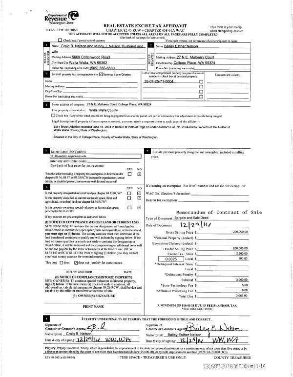 | 1 | 12/30/2016 | REAL ESTAT | REAL ESTATE CONTRACT | NELSON CRAIG B & MINDY JEAN | NELSON BAILEY ESTHER | | | $200,000.00 | 131687 | 2016-10787 |