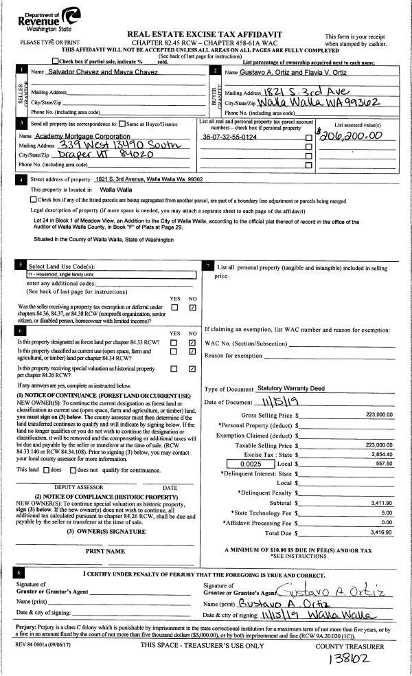 | 1 | 11/18/2019 | SWD | STATUTORY WARRANTY DEED | CHAVEZ SALVADOR & MAYRA | ORTIZ GUSTAVO A & FLAVIA V | | | $223,000.00 | 138102 | 2019-09535 |