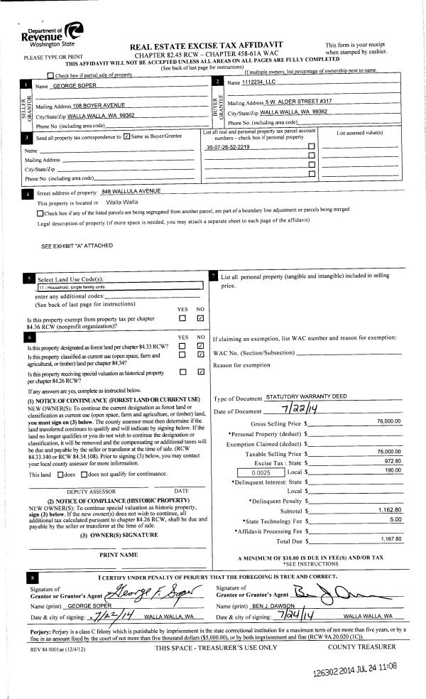 | 2 | 07/24/2014 | SWD | STATUTORY WARRANTY DEED | SOPER GEORGE F SR | 1112234 LLC | | | $76,000.00 | 126302 | 2014-05193 |