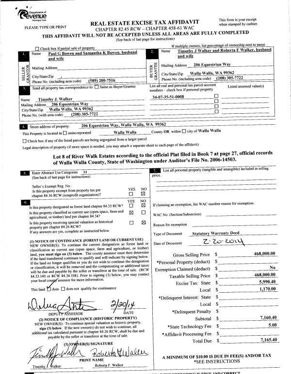 | 4 | 02/20/2014 | SWD | STATUTORY WARRANTY DEED | BOWEN PAUL G & SAMANTHA K | WALKER TIMOTHY J & ROBERTA F | | | $468,000.00 | 125456 | 2014-01256 |
