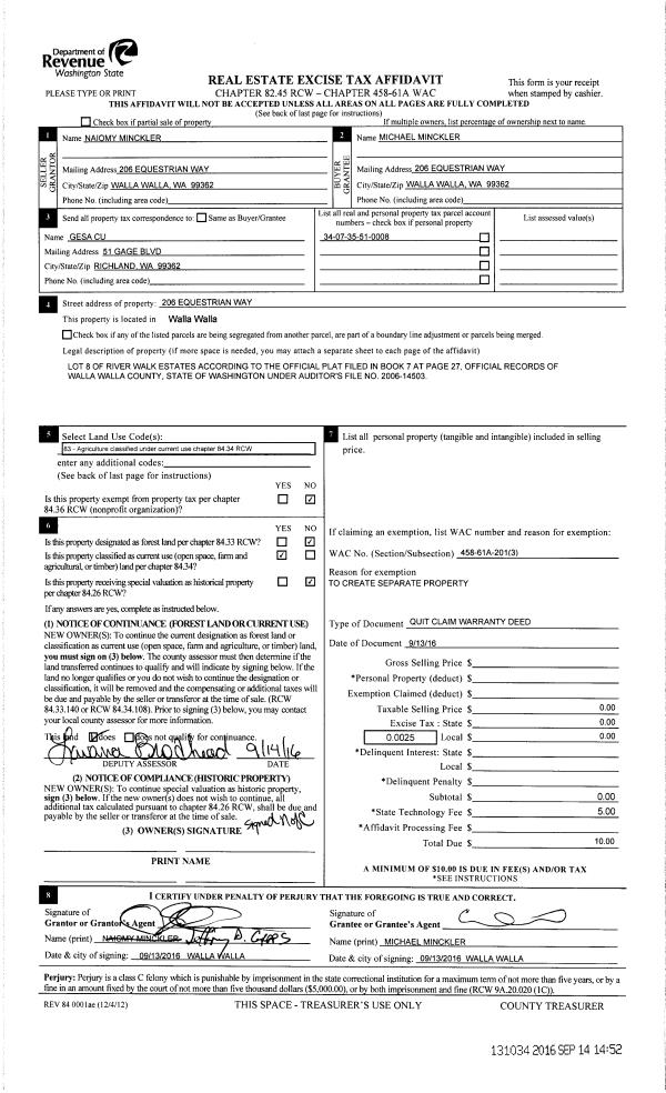 | 2 | 09/14/2016 | QCD | QUIT CLAIM DEED | MINCKLER NAIOMY | MINCKLER MICHAEL R | | | | 131034 | 2016-07500 |