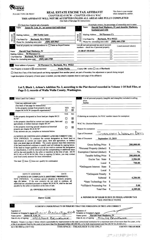 | 1 | 09/18/2019 | SWD | STATUTORY WARRANTY DEED | LOTT JAMES R JR | MATHEWS HAROLD NEAL IV & JENNIFER | | | $280,000.00 | 137716 | 2019-07331 |